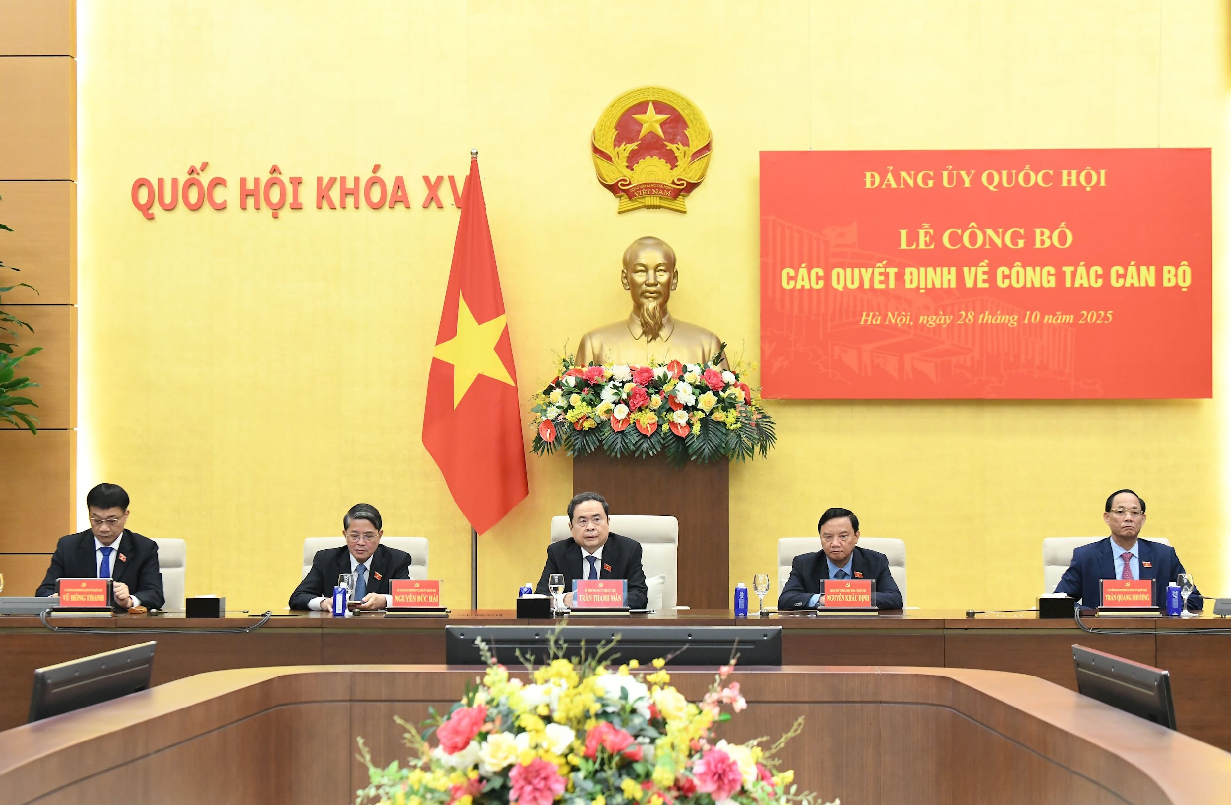 Chiều nay, 28/10, tại Nhà Quốc hội, Ủy viên Bộ Chính trị, Bí thư Đảng ủy Quốc hội, Chủ tịch Quốc hội Trần Thanh Mẫn chủ trì Lễ công bố các quyết định về công tác cán bộ của Đảng ủy Quốc hội.