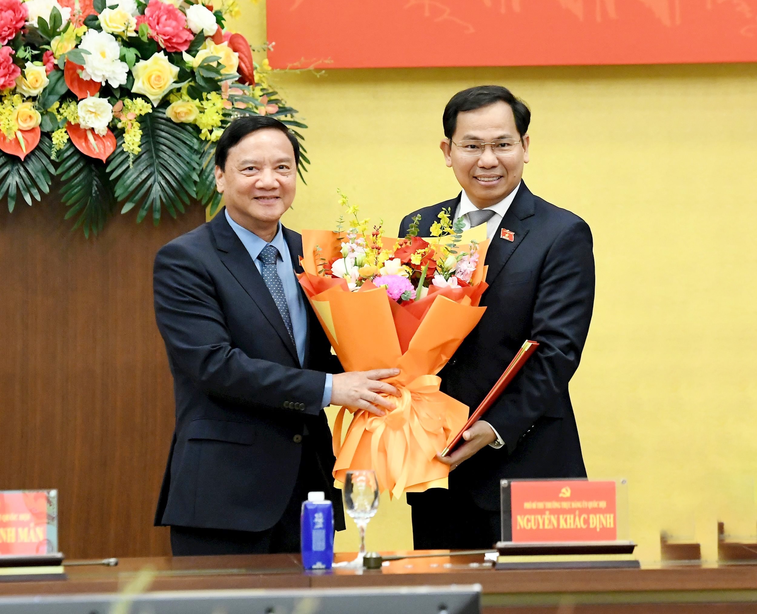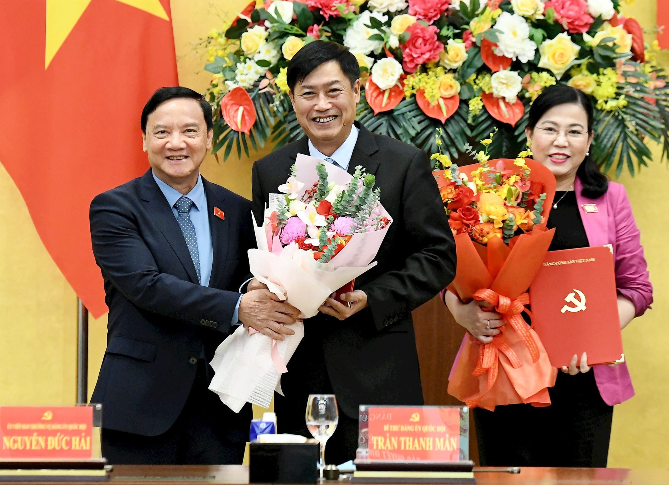 Thay mặt Đảng ủy Quốc hội, Bí thư Đảng ủy Quốc hội, Chủ tịch Quốc hội Trần Thanh Mẫn đã trao các quyết định; Phó Bí thư Đảng ủy Quốc hội, Phó Chủ tịch Quốc hội Nguyễn Khắc Định tặng hoa chúc mừng đồng chí Lê Quang Mạnh, đồng chí Nguyễn Thanh Hải và đồng chí Nguyễn Hữu Đông.