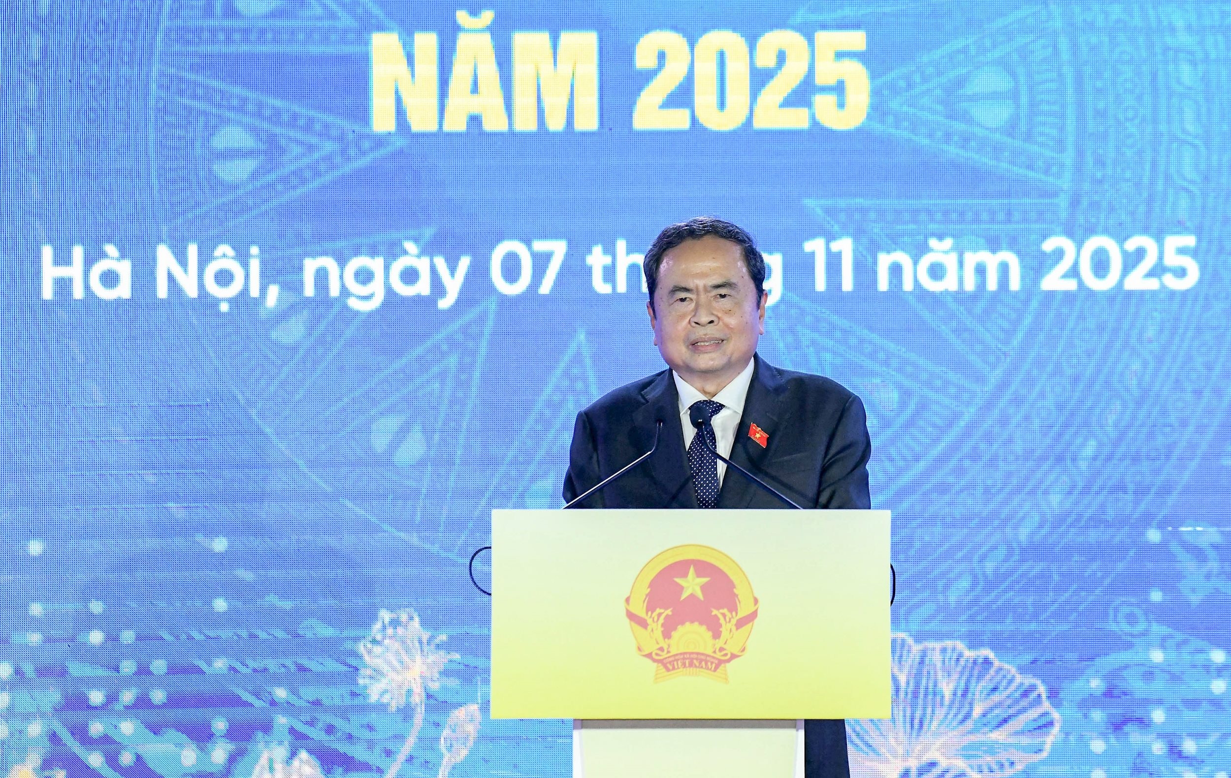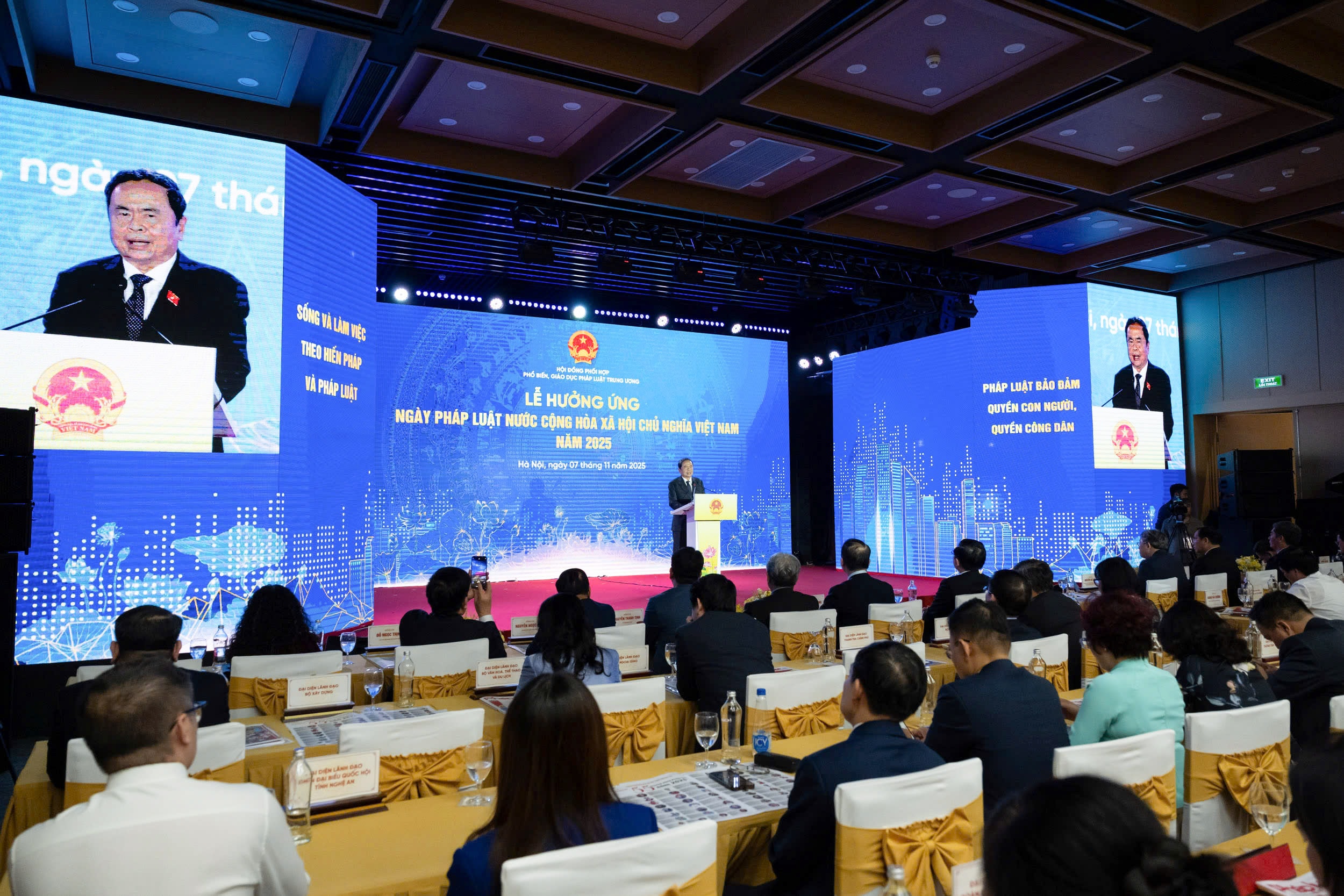 Phát biểu chỉ đạo tại buổi lễ, Chủ tịch Quốc hội Trần Thanh Mẫn bày tỏ vui mừng dự Lễ hưởng ứng Ngày Pháp luật nước Cộng hòa xã hội chủ nghĩa Việt Nam năm 2025 trong không khí toàn Đảng, toàn dân, toàn quân ta đang ra sức thi đua lập thành tích chào mừng Đại hội XIV của Đảng, chuẩn bị bầu cử đại biểu Quốc hội khóa XVI và HĐND các cấp nhiệm kỳ 2026 - 2031.