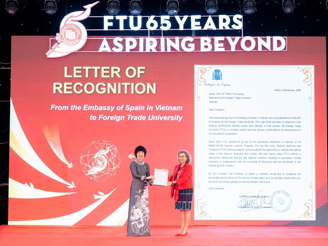 Bà Carmen Cano De Lasala - Đại sứ Đặc mệnh Toàn quyền Vương quốc Tây Ban Nha tại Việt Nam trao Thư ghi nhận và chúc mừng tới Trường Đại học Ngoại Thương. Những nỗ lực của Nhà trường trong những năm gần đây để xây dựng nền móng vững chắc cho việc giảng dạy và phát triển tiếng Tây Ban Nha cùng văn hóa và kinh doanh quốc tế, đã góp phần thúc đẩy giao lưu văn hóa, tăng cường hiểu biết lẫn nhau giữa sinh viên hai nước và mở ra nhiều cơ hội hợp tác mới trong lĩnh vực giáo dục đại học.