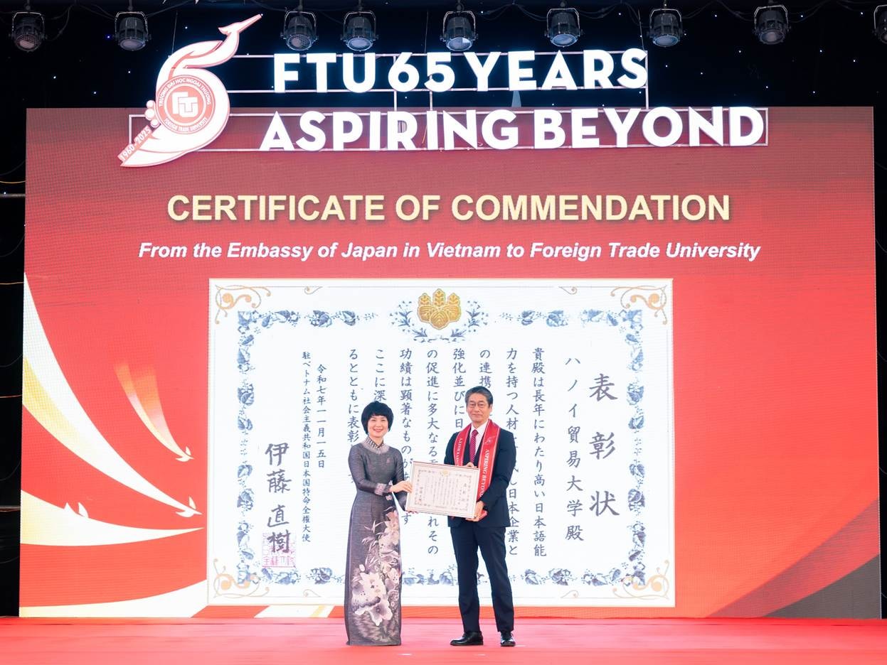 Ngài Ito Naoki - Đại sứ Đặc mệnh Toàn quyền Nhật Bản tại Việt Nam trao Bằng khen ghi nhận những đóng góp của Trường Đại học Ngoại Thương trong thúc đẩy hợp tác giáo dục giữa Việt Nam và Nhật Bản. Là 1 trong những trường đại học đầu tiên đào tạo tiếng Nhật ở Việt nam, trong suốt nhiều năm qua, Trường Đại học Ngoại Thương đã xây dựng và duy trì mối quan hệ hợp tác sâu sắc với gần 100 các trường đại học cùng gần 50 tổ chức và doanh nghiệp Nhật Bản trong đào tạo, nghiên cứu và trao đổi học thuật, góp phần thắt chặt quan hệ hữu nghị Việt Nam – Nhật Bản.